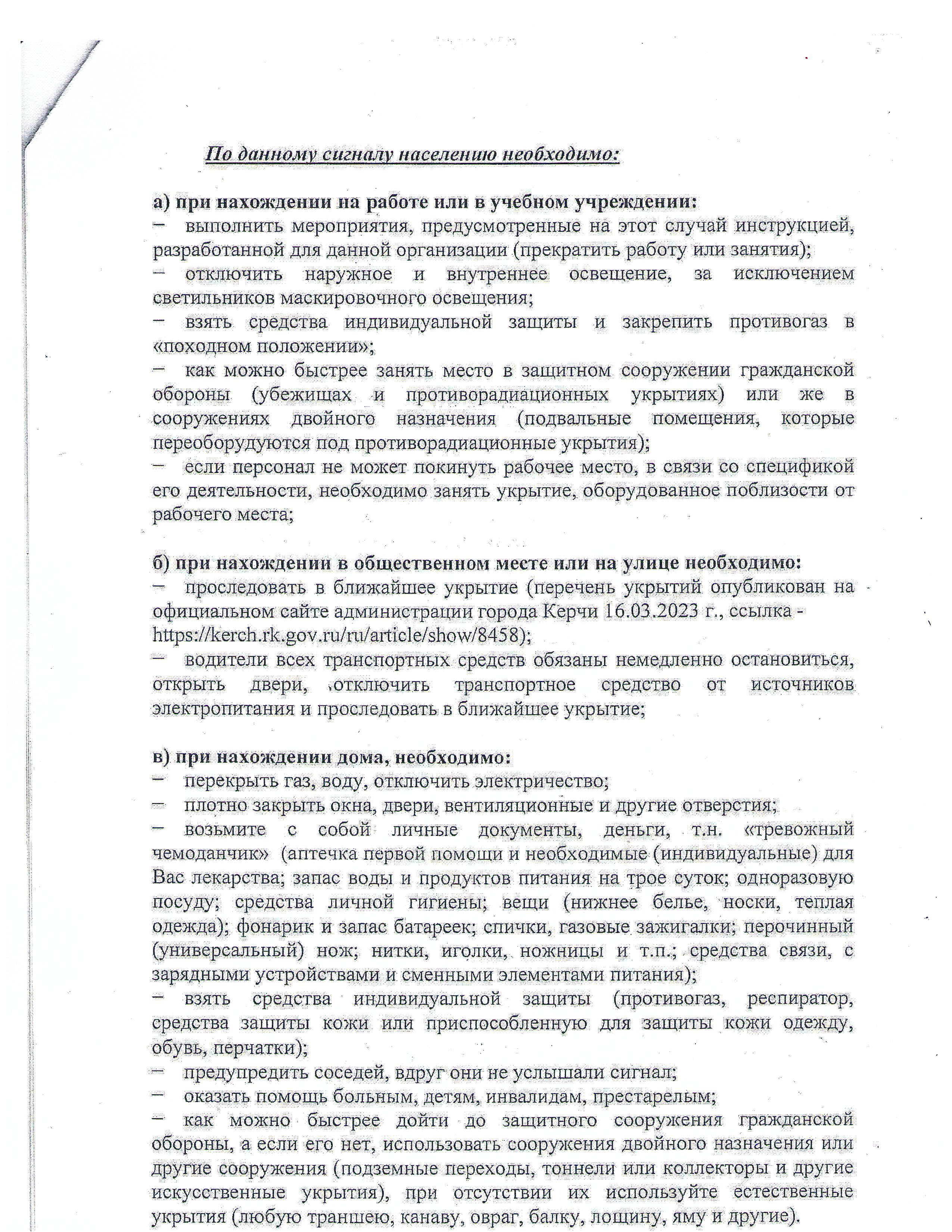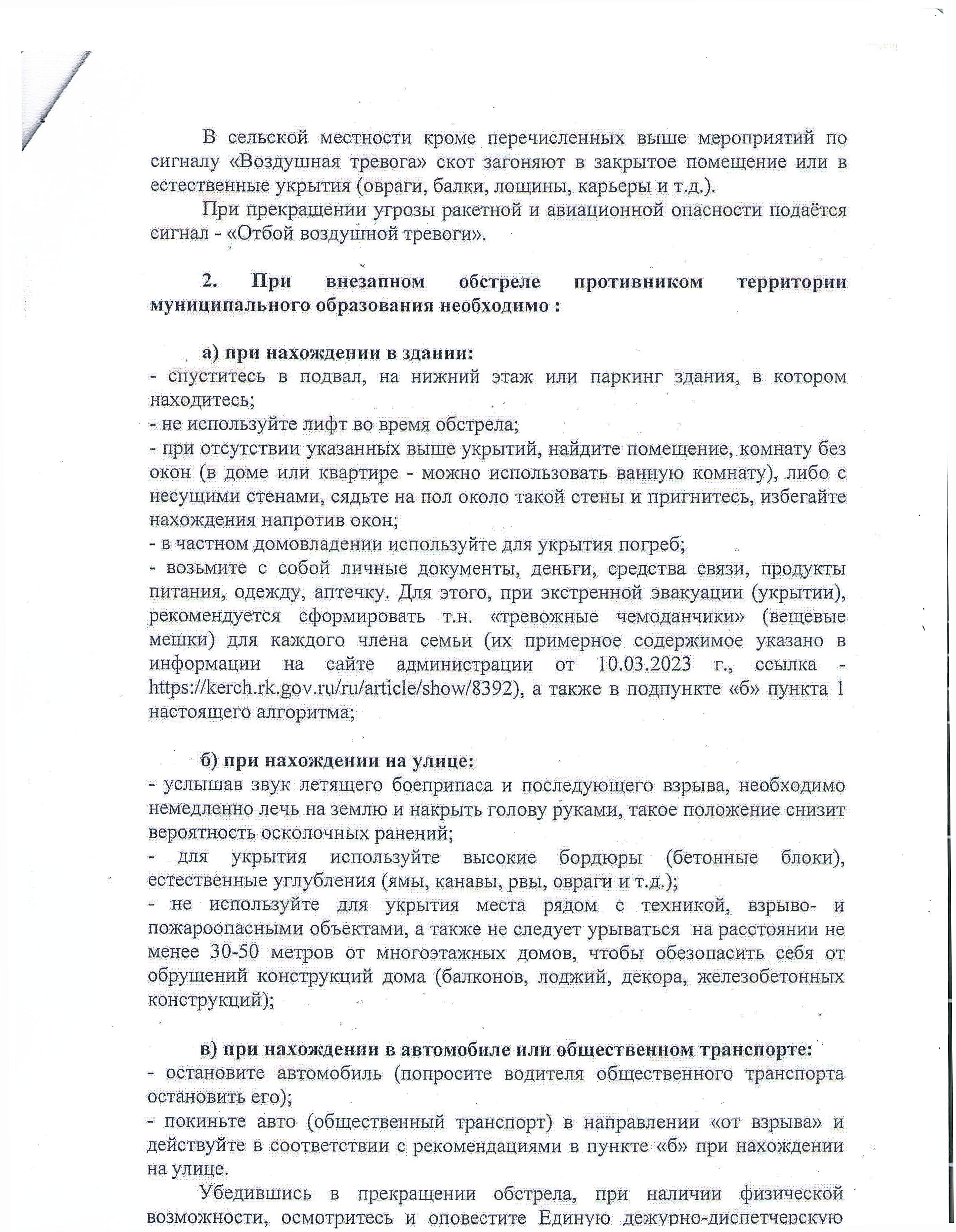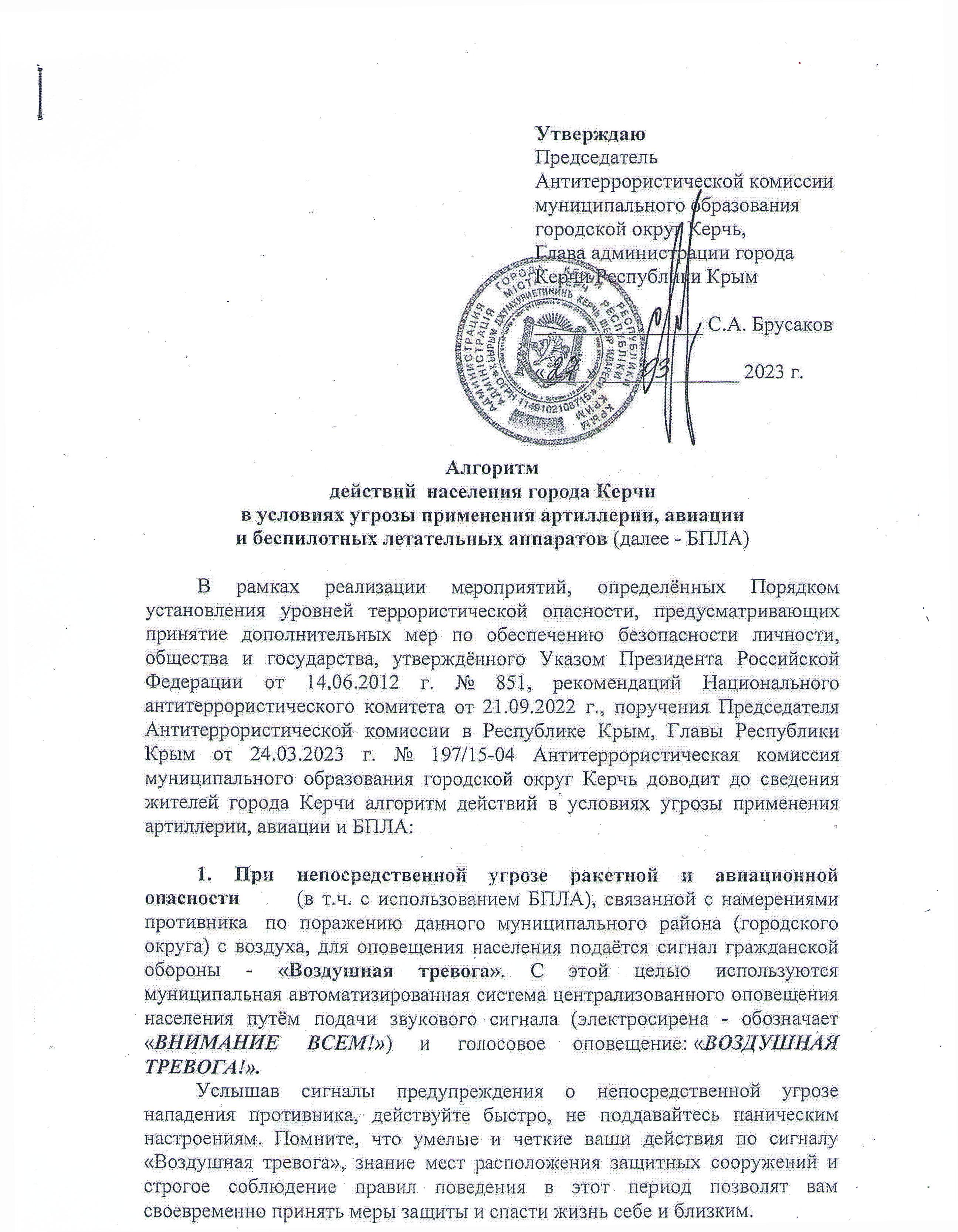 АЛГОРИТМ ДЕЙСТВИЙ НАСЕЛЕНИЯ ГОРОДА КЕРЧИ В УСЛОВИЯХ УГРОЗЫ ПРИМЕНЕНИЯ АРТИЛЛЕРИИ, АВИАЦИИ И БЕСПИЛОТНЫХ ЛЕТЕТЕЛЬНЫХ АППАРАТОВ