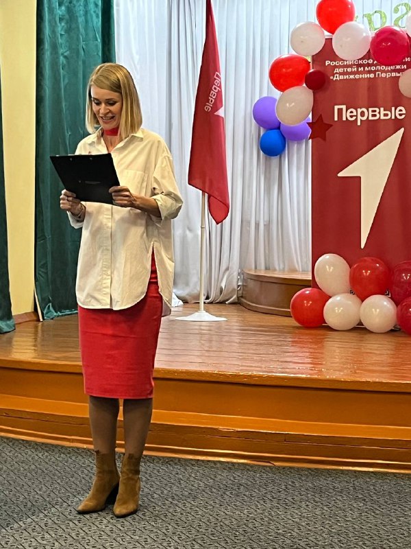 С приветственными словами к участникам праздничного мероприятия обратились директор школы Татьяна Олеговна Терлецкая и приглашенные гости: председатель "Движение Первых" Линник О.В. и специалист по организации работы "Движение Первых" Костюкова Т.А.