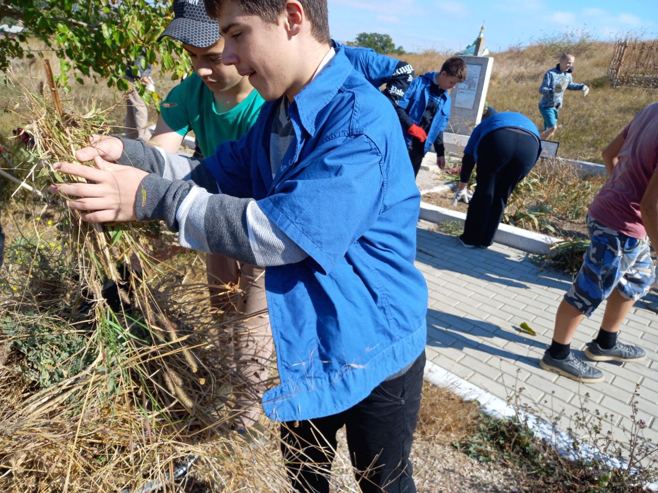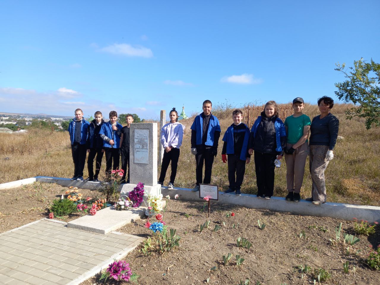 02 .10.25 г. силами учеников 7 класса вместе с учителями труда Сопиной Т.Е. и Котеленец А.В. была произведена очистка памятника, убран и вывезен сухостой и мусор.